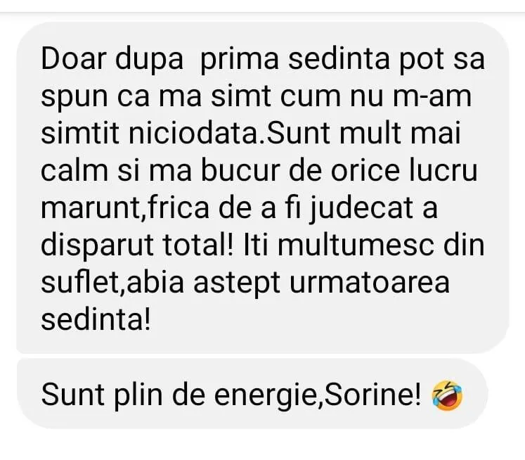 De la prima şedinţă. Vei fi mai echilibrată emoţional, împăcată, plină de energie, îţi vei recăpăta pacea şi vei descoperi alte opţiuni. În doar 1-3 ședințe îți vei putea continua viaţa eliberată de trauma care acum te ţine blocată.